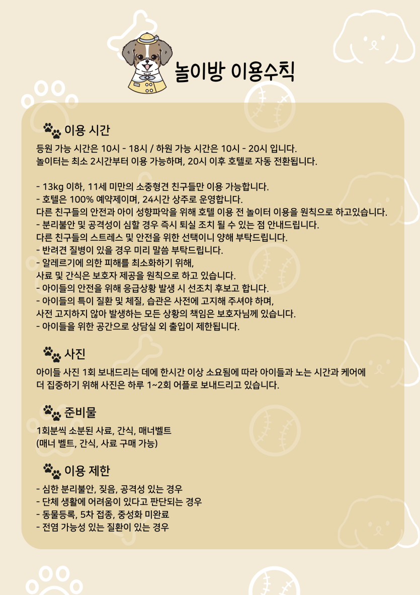 댕스테이 - 놀이방, 호텔 모두 사전예약 후 시간연장 가능합니다.